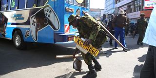 Police officers confiscate registration plates of matatus blocking roads within the CBD amid a nationwide matatu strike.
