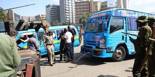 Police officers tow a matatu blocking the road along Haile Selassie Avenue in Nairobi.