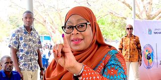 On October 29, 2025, the President of the United Republic of Tanzania and candidate for the same position through the Chama Cha Mapinduzi (CCM) party, Dr Samia Suluhu Hassan, casts her vote at the Chamwino Village Office polling station in Dodoma.