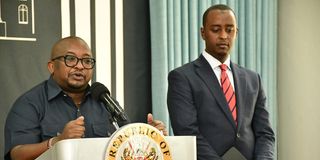 Housing PS Charles Hinga addresses a press briefing on the housing levy at State House, Nairobi flanked by State House spokesperson Hussein Mohamed.