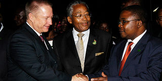 RVR managing director Roy Puffet and Kenya Transport minister Ali Mwakwere and Eng. John Byabagambi Minister for works Uganda (Right) during the launch of the Rift Valley Railways in Nairobi.