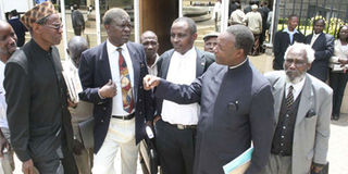 Former MPs Koigi wa Wamwere, Otieno Mak'Onyango, Wanyiri Kihoro Njeru Kathangu and an activist outside the High Court. PHOTO | FILE | NATION MEDIA GROUP