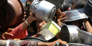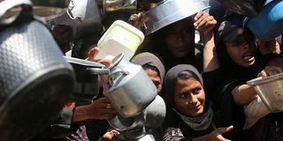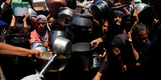 Palestinians wait to receive food from a charity kitchen, amid a hunger crisis, in Khan Younis, southern Gaza Strip, August 4, 2025.