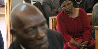 Uasin Gishu politician and farmer Jackson Kibor (left), who went to court seeking to divorce his second wife Josephine Jepkoech Kibor (background), at an Eldoret Law Courts on February 7, 2017. A ruling on an application by Jepkoech’s lawyer to have the case moved to another court will be heard on March 1. PHOTO | JARED NYATAYA | NATION MEDIA GROUP
