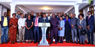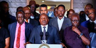 Deputy President Kithure Kindiki (centre) speaks, joined by members of the national funeral committee overseeing the burial arrangements of former Prime Minister Raila Odinga at the DP's official residence in Karen, Nairobi, on October 15, 2025.