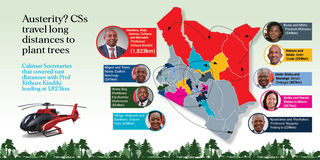 At an average of four hours per helicopter hired, the average cost easily exceeds the Sh1 million mark to a whopping Sh1.2 million. At least 23 Cabinet Secretaries were dispatched, with only two, Head of Civil Service Felix Koskei and Secretary to the Cabinet Mercy Wanjiru, sent to plant trees in Nairobi, effectively leaving 21 ministers to hire choppers.