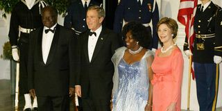 In this file picture, then US President George Bush (second left), Kenyan President Mwai Kibaki (left), Kenyan First Lady Lucy Kibaki (second right) and US First Lady Laura Bush at the North Portico of the White House in Washington DC on October 6, 2003.