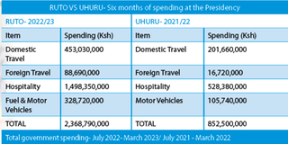 A comparison of the spending by President Ruto and his predecessor shows that the current Presidency has shown much extravagance, spending 2.78 times what the previous Presidency spent between October 2021 and March 2022.