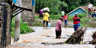 Residents walk through water in Bosnia in Kahawa Wendani in Kiambu County, on May 01, 2024 after heavy rains that left the area flooded.