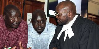 From left: Stephen Cheburet Morogo and Fredrick Ole Leliman with lawyer Cliff Ombeta (right) in a Nairobi Court on October 8, 2019.