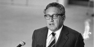 US Secretary of State Henry Kissinger gives a speech at his arrival at the Orly airport, on September 6, 1976 for an official visit in France.