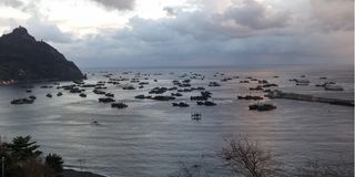 Chinese pair trawlers anchored in the harbor of Ulleung island in South Korea.