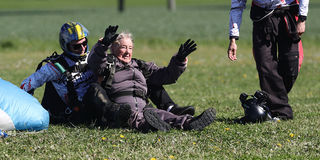 The pair sailed down to the ground smoothly, as helpers rushed to Larsson's side with her walker to help her get up.