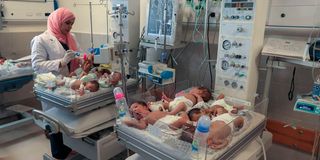 A Palestinian medic cares for premature babies, evacuated from Gaza City's Al Shifa hospital, ahead of their transfer from a hospital in Rafah in the southern Gaza Strip to Egypt, on November 20, 2023, amid ongoing battles between Israel and the militant group Hamas.
