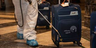 A worker sanitises a pilgrim's luggage in a hotel lobby located near the Grand Mosque in Saudi Arabia's holy city of Mecca.
