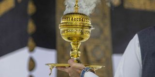 A member of the hajj staff burns incense while a few pilgrims circumambulate the Kaaba, Islam's holiest shrine, at the Grand Mosque in the holy city of Mecca, on July 26, 2020. PHOTO | AFP