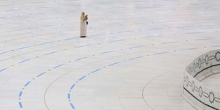 A mask-clad woman stands on a ring delineating where worshippers be around the Kaaba. PHOTO | AFP