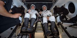 NASA astronauts Robert Behnken, left, and Douglas Hurley are seen inside the SpaceX Crew Dragon Endeavour spacecraft onboard the SpaceX GO Navigator recovery ship shortly after having landed in the Gulf of Mexico off the coast of Pensacola, Florida on August 2, 2020.