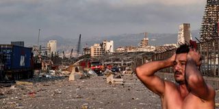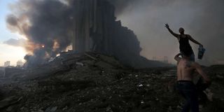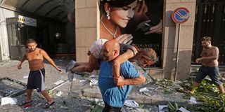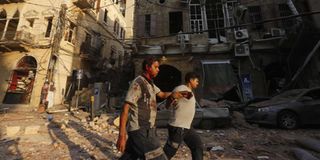 A wounded man is helped as he walks through debris in Beirut's Gemmayzeh district following a twin explosion at the port of Lebanon's capital on August 4, 2020. Photo | Marwan Tahtah | Afp