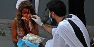 A wounded woman receives help outside a hospital following an explosion in the Lebanese capital Beirut on August 4, 2020. Photo | Afp