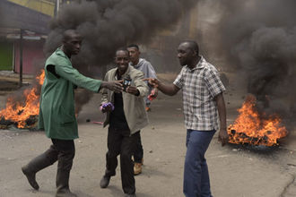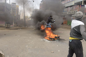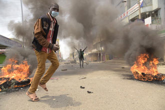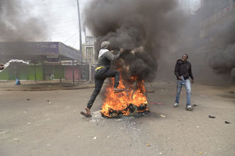 A man jumps over a fire lit on the road by the protesting Nakuru matatu operators on September 28, 2020.