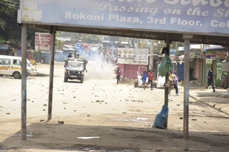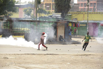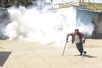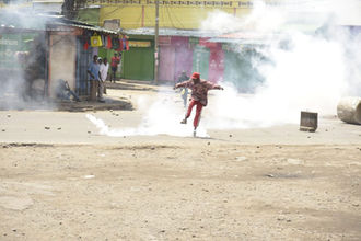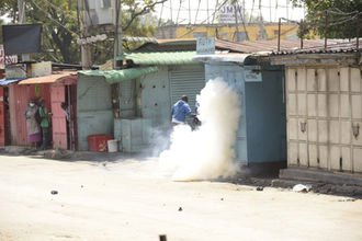 Traders watch as two men escape from tear gas thrown at them by anti-riot police.
