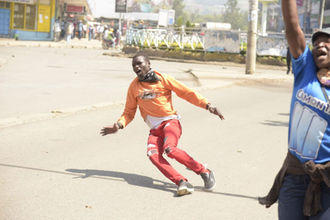 A man jumps amid a tear gas cloud in Nakuru town on September 28, 2020 during a protest by matatu operators.
