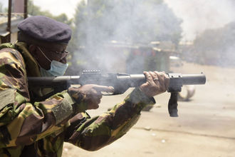 Anti-riot police officer fires a tear gas canister at protestors in Nakuru on September 28, 2020.