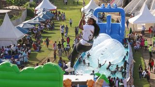 Children enjoy a ride in a floating tube at Cprus Park in Nakuru City on December 26, 2025, as families visit the park to celebrate Boxing Day.