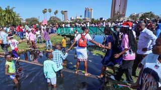 Children assist revellers to cross a water channel for a fee of Sh10 at Uhuru Park, Nairobi, on December 25, 2025, after the footbridge became overcrowded, as thousands of city residents celebrate Christmas in the capital—highlighting how the city remains vibrant despite a mass exodus to the Coast and upcountry destinations, with many choosing, or constrained by finances, to spend the festive season in public recreational spaces.