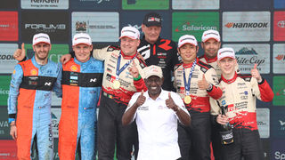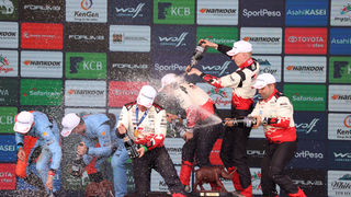 Podium-finishing teams celebrate with champagne during the WRC Safari Rally Kenya on March 15, 2026, at Hell's Gate National Park. From left: Team Hyundai’s Adrien Fourmaux and co-driver Alexandre Coria (first runners-up); winners Team Toyota’s Takamoto Katsuta with co-driver Aaron Johnston; and Sami Pajari with co-driver Marko Salminen (second runners-up).