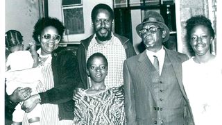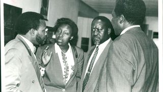 June 21, 1991: Mr. Raila Odinga who was the sole political detainee still held is freed from detention after 11 months. President Moi announced his release during his address to the Kanu Annual Delegates Conference at the Kasarani Sports Complex. Family reunion. Mr. Oginga Odinga (second right) with his son, Raila, and members of Raila's family at Kileleshwa in Nairobi . They are Mrs. Ida Raila (holding little Winnie), Raila Junior and Rosemary.