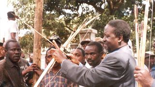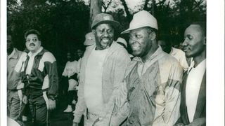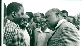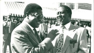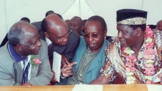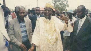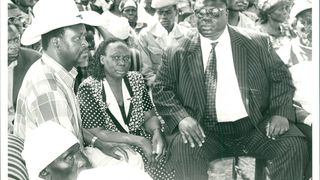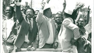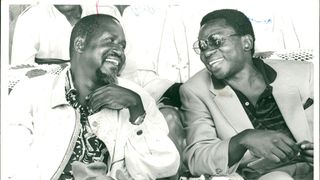 May 9, 1997: Ford Asili Chairman Kenneth Matiba (right) publicly challenges Lang’ata MP Raila Odinga to state categorically whether he would support him in removing President Moi from power. "I am saying good-bye to you right here if you do not promise to join me to remove Moi from State House he told Mr. Odinga, when the two were touring the Korogocho slum."Please tell the people if you will join me to do that right here because I will not call you to any other meeting to say so!" Mr Matiba said, handing over the microphone to Mr Odinga ... Accepting the microphone, Mr. Odinga told the crowd: "I have been asked a question and I wish to assure you that I will support you!" Mr Matiba was addressing hundreds of residents of Korogocho when he toured the sprawling slum area accompanied by Mr Odinga, area MP Ochieng Mbeo and legislators Kamau lcharia (Kiambaa), Philip Gitonga (Lari), former area MP Munyua Waiyaki and several FORD-Asili and National Development Party of Kenya officials.