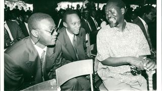 Sons of fallen heroes: Mr. Oginga Odinga's son Raila (right) in a discussion with Mr. Uhuru Kenyatta (centre), son of the late President Jomo Kenyatta and Mr. Peter Mboya, son of the late Tom Mboya, at Jaramogi's funeral. 5 Feb 94.