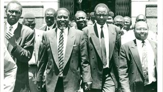 A show of solidarity, legislator James Orengo with Langata MP Raila Odinga and other Ford Kenya supporters after Mr. Orengo was released on bail by a Kisii court yesterday. Mr. Orengo had been remanded in police custody on a charge of creating a disturbance.
