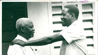 March 23, 1983: The High Court discharges Mr Raila Amolo Odinga, a son of former Vice-President Jaramogi Oginga Odinga, and a former ‘Sunday Standard’ assistant managing editor, Mr Otieno Mak’Onyango, on charges of plotting to overthrow the government of President Daniel arap Moi on August 1, 1982. They duo was, however, rearrested immediately. Here, Raila is greeted by his father in 1988 after being released from detention.