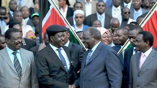August 5, 2010: President Mwai Kibaki (2R) and Prime Minister Raila Odinga (2L) shake hands after their official announcement to the public of provisional results of Kenya's constitutional referendum in Nairobi on August 5, 2010, flanked by vice president Kalonzo Musyoka (R) and second deputy prime minister Musalia Mudavadi (L). Kenyan President Mwai Kibaki hailed huge voter backing for a proposed new constitution in a referendum that week; "We are happy to welcome the provisional results of the referendum," Kibaki told several hundred supporters in central Nairobi. "The historic journey that we began 20 years ago is now coming to a happy end.", he added. The electoral panel was yet to issue final results but a provisional tally showed the "yes" camp had a wide lead against its opponents who had already admitted defeat.