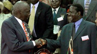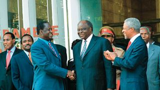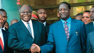 Kenya's President and ruling party Kanu (Kenya Africa National Union) chairman Daniel arap Moi (L), congratulates 18 March 2000 in Nairobi, Raila Odinga, leader of the opposition National Development Party, after Odinga dissolved his party to join Kanu. The only ruling party Kenya has known since independence, KANU underwent a makeover months ahead of one of the most important elections in national history.