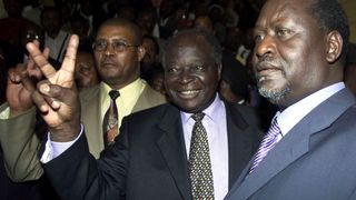 Members of Kenya's new "National Rainbow Coalition" Raila Odinga (R) and the coalition's presidential candidate Mwai Kibaki (C), greet the press before addressing thousands of opposition supporters outside a Nairobi hotel, October 22, 2002. Kenya's opposition picked two-time presidential election loser Kibaki to face off against president Daniel arap Moi's chosen successor in upcoming polls.