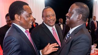 President Uhuru Kenyatta and President Hakainde Hichilema of the Republic of Zambia with Azimio La Umoja One-Kenya presidential candidate Raila Odinga during the State Banquet at State House, Nairobi.