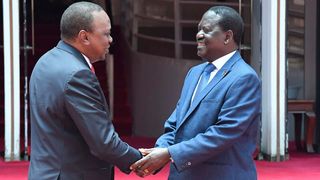 Kenya's President Uhuru Kenyatta (L) and National Super Alliance (NASA) coalition opposition leader Raila Odinga shake hands after addressing a press conference on March 9, 2018 at Harambee house office in Nairobi.