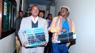 Nasa leaders Raila Odinga (R) and Kalonzo Musyoka together with other leaders carry petition to Supreme Courts on August 19, 2017. Nasa is challenging the reelection of president Uhuru Kenyatta after the general elections.
