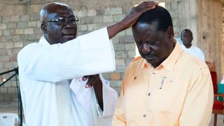 Dean of the A.C.K St. Stephen’s Cathedral Church in Kisumu Venerable Zephaniah Kore Omollo prays for NASA flagbearer Raila Odinga during a church service on May 21, 2017. Raila said he was feeling closer to God after visiting Israel's Wailing Wall where he repented of his sins and prayed for the country. He urged Kenyans not to vote for him or President Uhuru Kenyatta because of their tribes but to consider what they stand for.