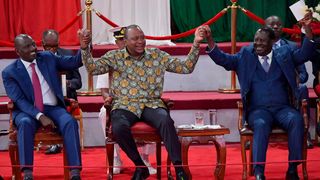 Kenya's President, Uhuru Kenyatta (C) raise their clasped hands with opposition leader and former Prime Minister, Raila Odinga (R) and Deputy President, William Ruto (L) on November 27, 2019, during the launch of the Building Bridges Initiative (BBI) report in Nairobi that ushers a national discussion on the future of Kenya and widely speculated to shape the Kenyatta succession and the 2022 politics. - The initiative is at the heart of the reconciliation of Kenyatta and Odinga, former bitter political rivals during the 2017 elections that left the east African nation submerged in post-poll chaos following a controversial electioneering process and outcome, and proposes a redistribution of power and national resources