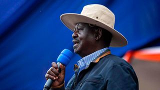 Azimio La Umoja (One Kenya Coalition Party) coalition presidential candidate Raila Odinga addresses the crowd during a campaign rally in Kirigiti Stadium, Kiambu, Kenya on August 1, 2022, ahead of Kenya's general election. - On August 9, 2022, Kenyans will head to the polls in a contested tight battle between veteran opposition leader Raila Odinga and current Deputy President William Ruto as they traverse the country vying for electorate support.