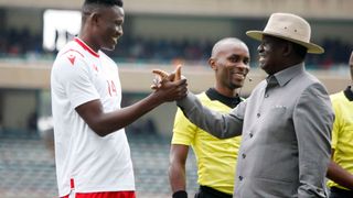 Harambee Stars Captain Michael Olunga (left) meets former prime Minister Raila Odinga on September 8, 2019 during International Friendly match between Kenya's Harambee Stars against Uganda Cranes at Moi International Sports Centre, Kasarani.