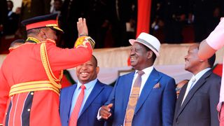 President Uhuru Kenyatta greeting Former Prime Minister Raila Odinga and Former Vice President Kalonzo Musyoka during 55th Jamhuri day celebrations held at Nyayo National Stadium on December 12, 2018.The President led the country in celebrations. Looking on is Nairobi Governor Mike Sonko.