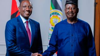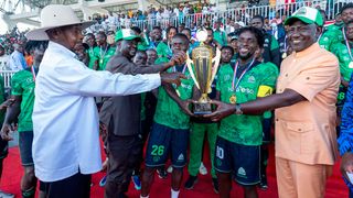 President William Ruto, his Ugandan counterpart Yoweri Museveni and the African Union Commission Chairperson candidate Raila Odinga present a trophy to Gor Mahia Football team after they defeated Uganda's Kitara Football team during the official launch of the 20,000-seater Jaramogi Oginga Odinga Stadium in Siaya county. They later watched a thrilling match between Gor Mahia and Uganda’s Kitara Football Club. President Ruto said that as leaders they were going beyond the boundaries to promote multinational sports competitions so as to deepen cross-border harmony, boost talent exchange and further regional integration. 2/01/2025