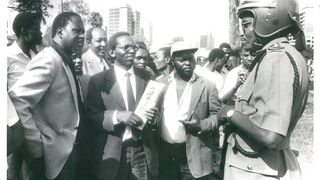 Chief Inspector Ikonya of the Nairobi Central Police Station, Nairobi, explains to members and suporters of the Release Political Prisoners pressure group, who included FORD Kenya's Langata MP Raila Odinga (left) why they were not allowed to plant trees at Freedom Corner to commemorate Political Prisoners Day.
