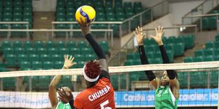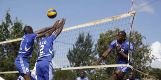 Wesley Rono (left) and Stephen Mathenge of General Service Unit (GSU) block an attack from Sila Kipruto of Kenya Prisons during the final of the Amaco International Volleyball Tournament at Eldoret Polytechnic on May 15, 2016.